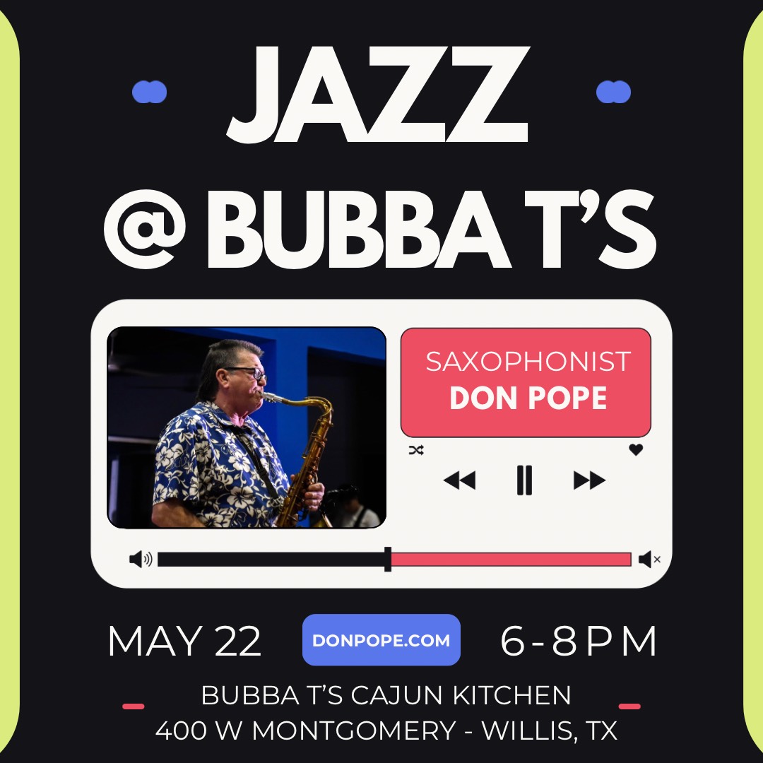 May 22 @ 6:00 pm - 8:00 pm Jazz @ Bubba T’s Bubba T's Kitchen 400 W Montgomery St, Willis, TX, United States