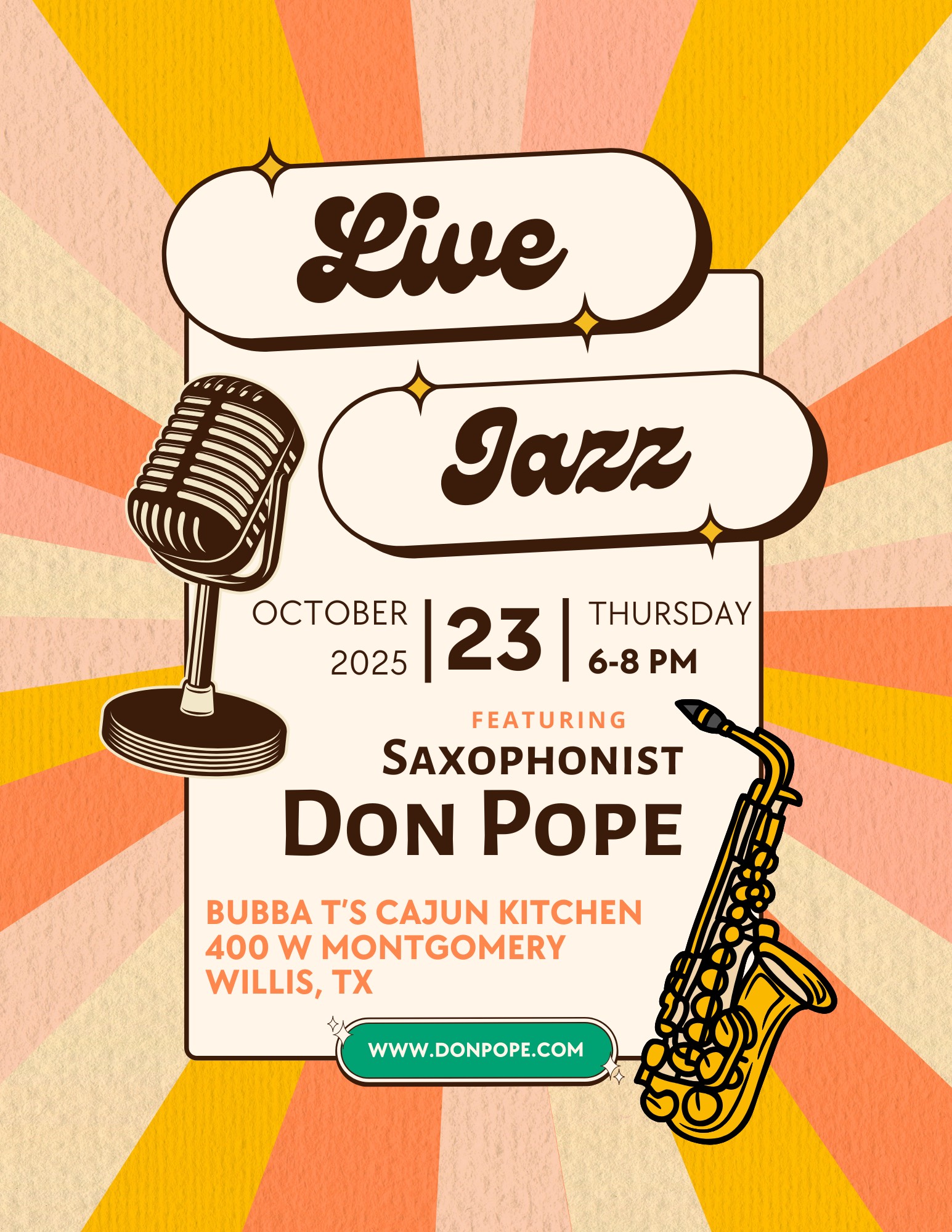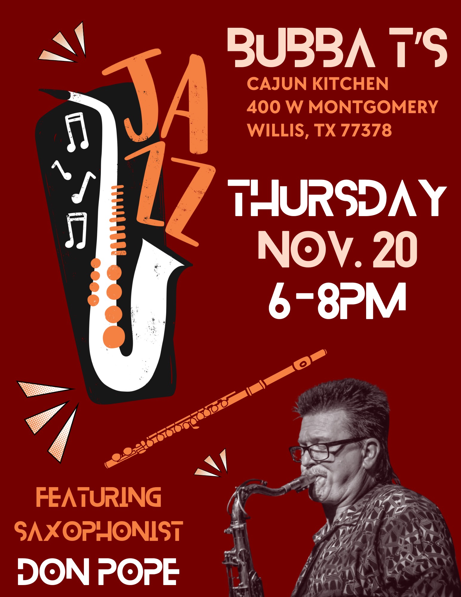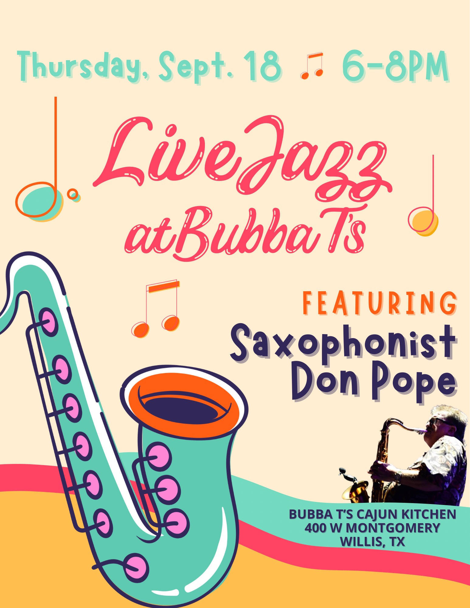 September 18 @ 6:00 pm - 8:00 pm Live Jazz at Bubba T’s Bubba T's Kitchen 400 W Montgomery St, Willis, TX, United States