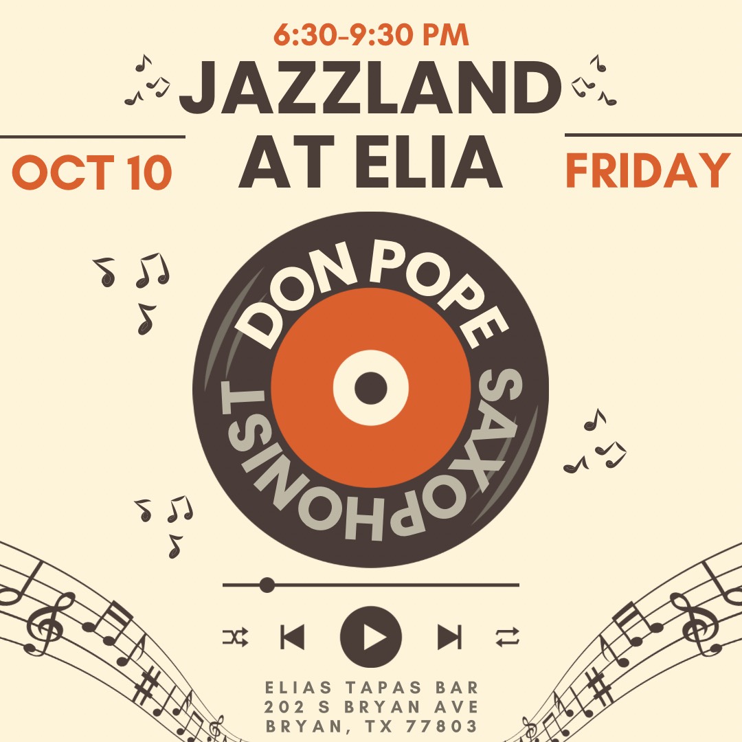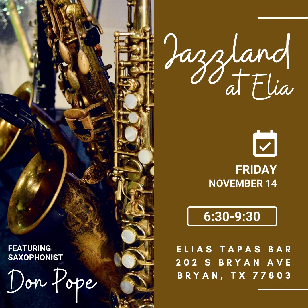 October 10 @ 6:30 pm - 9:30 pm Jazzland at Elia Elia Cafe Tapas Bar 202 S. Bryan Ave, Bryan, TX, United States
